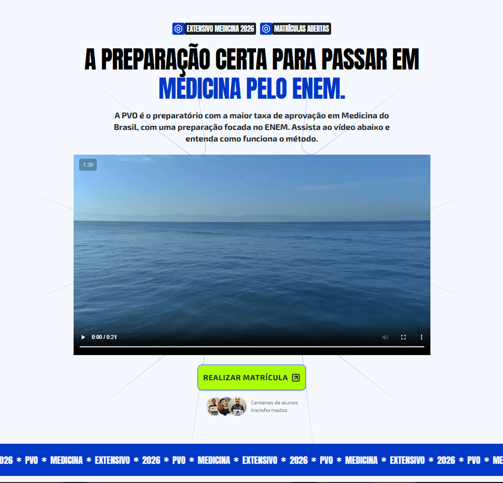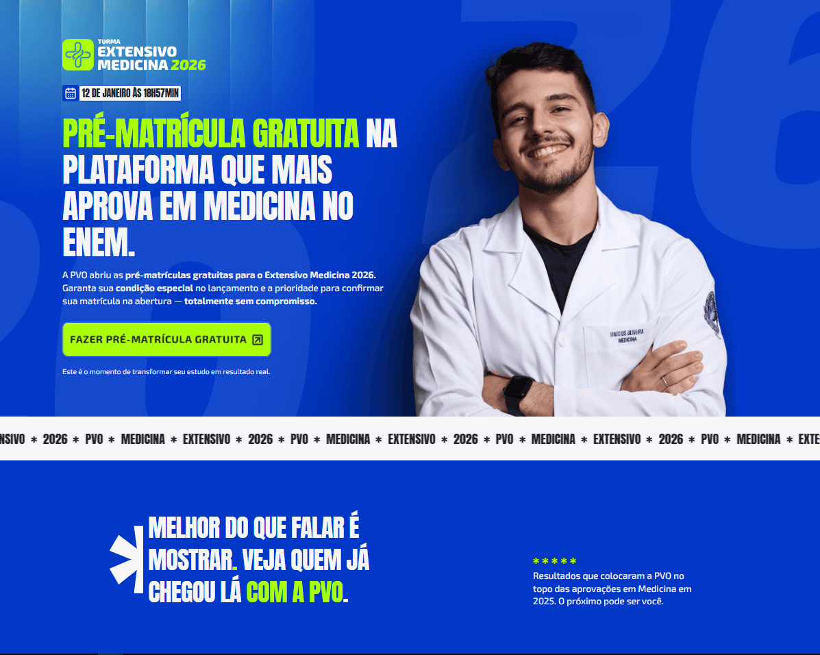 Desenvolvimento de duas páginas estratégicas para apresentar o Extensivo Medicina 2026, programa completo de preparação para o ENEM criado pelo expert Vinícius Oliveira.